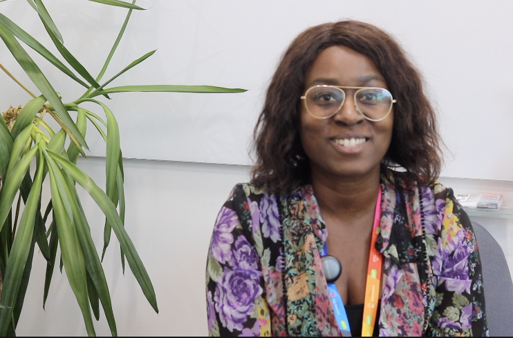 Lisa is a Black women, with shoulder length brown hair. She wears wide framed glasses and a colourful top. She smiles during an interview she filmed with PSS.