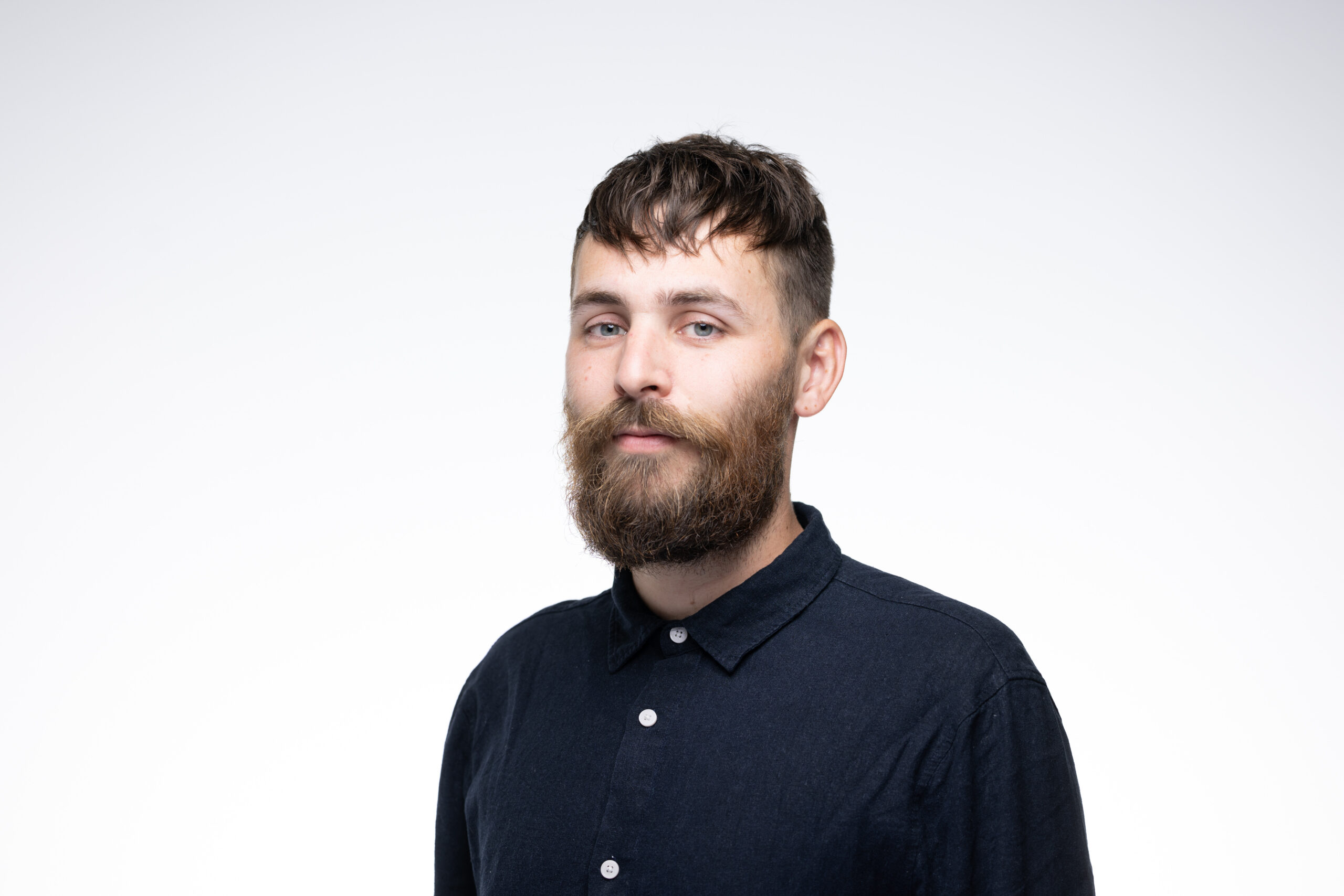 Tom is a slim white male with a big beard and brown hair - he is wearing a navy buttoned up shirt and the photo is quite professional - like a headshot. Tom looks really calm and approachable.