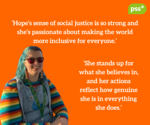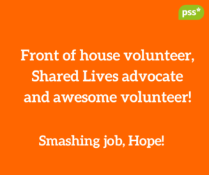 Hope is an amazing PSS volunteer and PSS Shared Lives ambassador. She’s also part of the All-Party Parliamentary Group and has been to number 10 Downing Street to hand in a petition for the My Vote My Voice campaign. A campaign which was all about raising awareness about how inaccessible voting can be, particularly for people with learning disabilities.