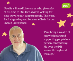 Paul is a Shared Lives carer who gives a lot of his time to PSS. He’s always looking for new ways he can support people. This year, Paul stepped up and became a Chair for our Shared Lives panel. He offers a wealth of knowledge around supporting people in a person-centred way. He lives the PSS values through and through.